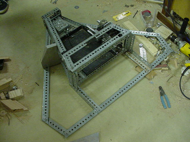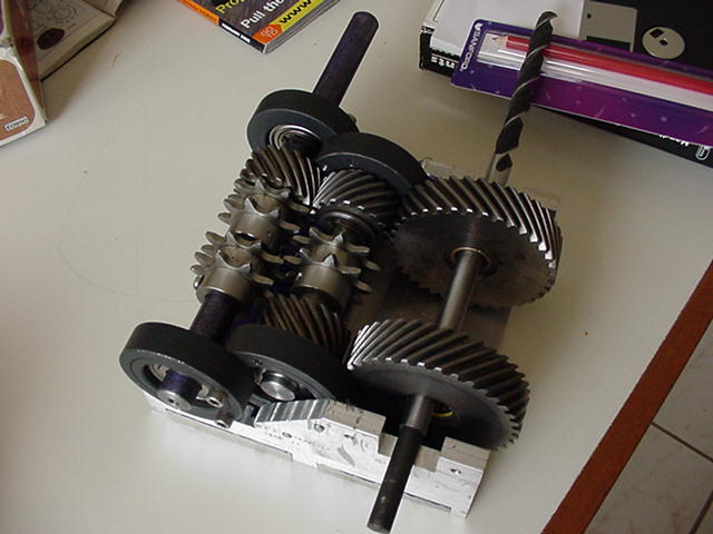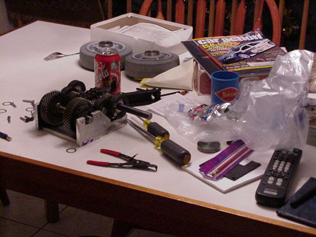 CJ will be gone for the next three weeks, due driving lessons. We are seriously considering the reliability of the current drive train and searching for other options. Reverse is coming bact to haunt us... We are thinking of a manual transmission like reverse, with slider gears, but have yet to design it. Being in band, Mark is now practing at every waking moment...God I hate this... and work will not continue at an acceptable rate for a few weeks.